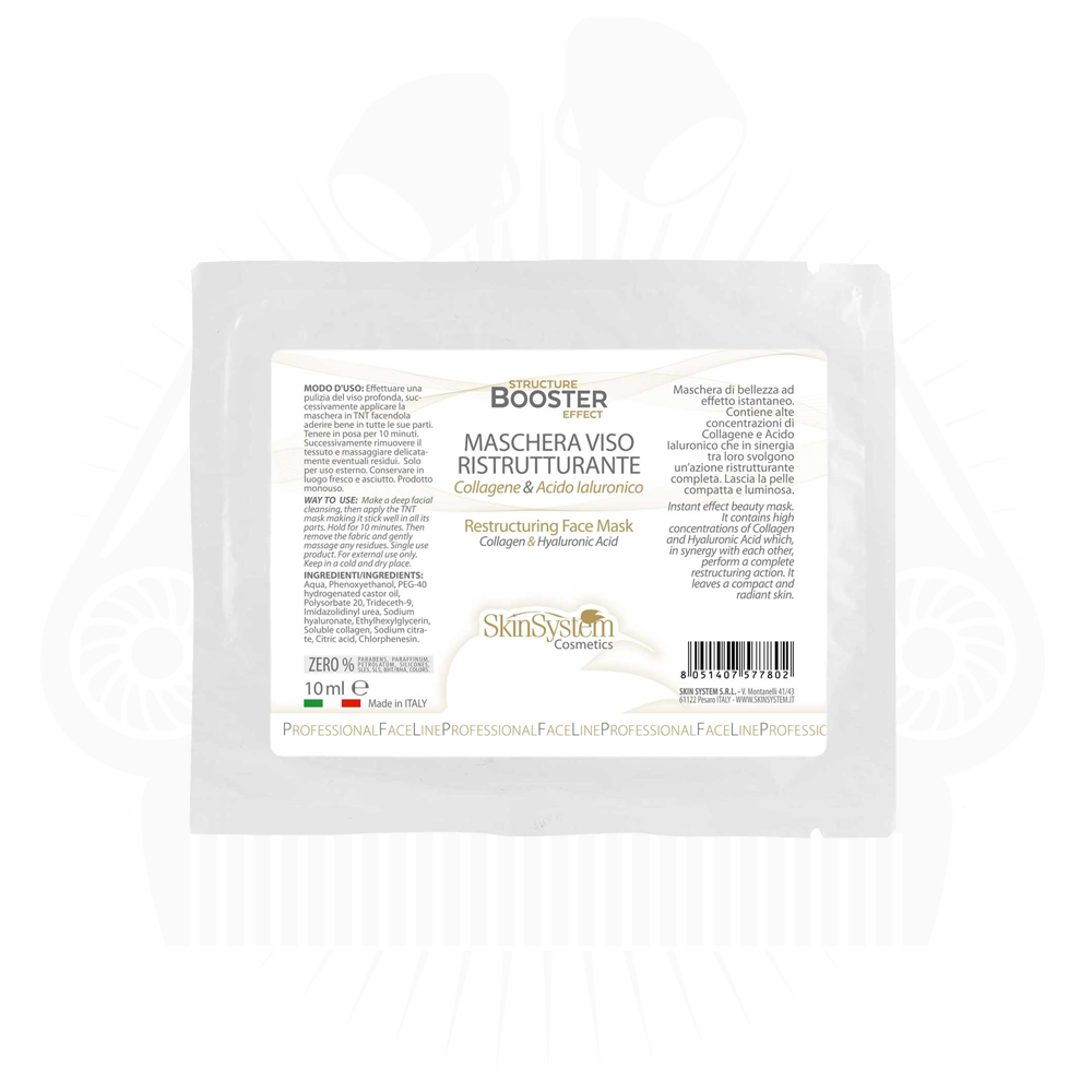 Maschera di bellezza ad effetto istantaneo. Contiene alte concentrazioni di Collagene e Acido Ialuronico che in sinergia tra loro svolgono un’azione ristrutturante completa. Senza profumo, lascia la pelle compatta e luminosa.